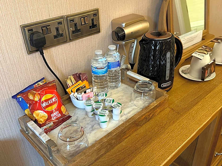 Features a wall-mounted flat-screen TV, a mini bar fridge and a dressing table and chair. There is complimentary water, tea, coffee and hot chocolate, snacks and biscuits. Toiletries are also included.